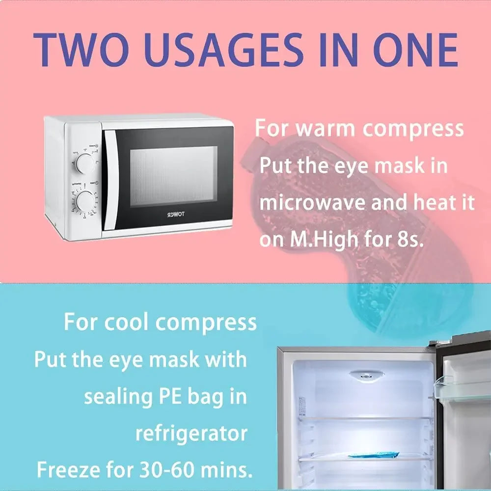 Hot Use: Please put the eye mask into hot water for 5 minutes(hot water temperature is about 60 degrees), then you can use.